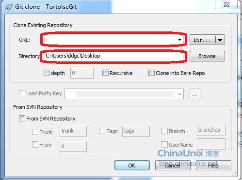 a、桌面空白处右键,选择git clone添加版本库地址URL和本地文件夹。如下图所示: