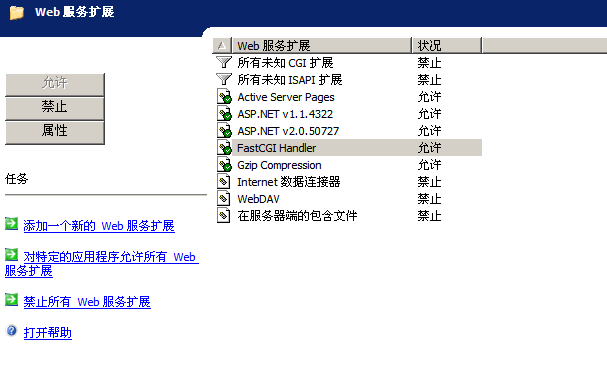 6. 在IIS管理器里面,点击web服务扩展,看FastCGI Handler是不是允许,使之允许。