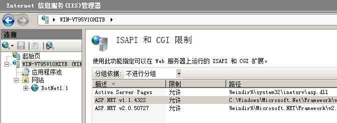 开始配置IIS了,打开服务器管理,角色,Internet信息服务器管理器,开打ISAP和CGI限制,设置ASP.NET1.1为允许