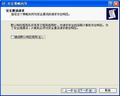 在向导中点击“下一步”按钮,为新的安全策略命名;再按“下一步”,则显示安全通信请求画面,在画面上把“激活默认相应规则”左边的钩去掉,再点击'下一步'