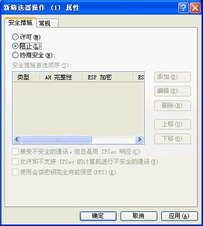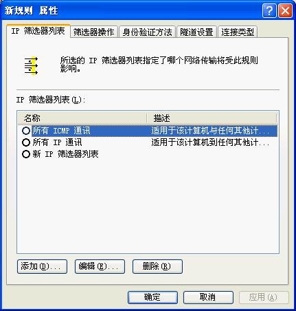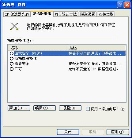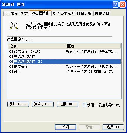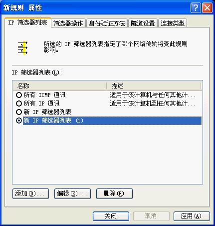 点击“应用”按钮,关闭对话框;回到“新IP安全策略属性”对话框,在“新的IP筛选器列表”左边打钩