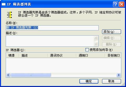 在画面上点击“添加”按钮,弹出IP筛选器列表窗口;在列表中,首先把“使用添加向导”左边的钩去掉,然后再点击右边的“添加”按钮添加新的筛选器。