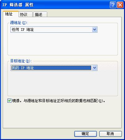 第三步,进入“筛选器属性”对话框,首先看到的是寻址,源地址选“任何 IP 地址”,目标地址选“我的 IP 地址”。