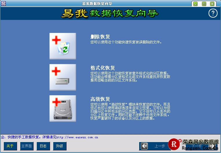 《易我数据恢复向导》是首款国内自主研发的数据恢复软件,是一款功能强大并且性价比非常高的数据恢复软件。本软件在WINDOWS操作系统下,提供FAT12/ FAT16/FAT32/VFAT/NTFS/NTFS5分区的数据恢复,支持IDE/ATA、SATA、SCSI、USB、IEEE1394种类的硬盘或闪盘、软盘、数码相机、数码摄像机和USB种类的存储盘。本软件具有删除恢复、格式化恢复、高级恢复等非常强大的功能,可以针对不同情况的数据丢失来进行数据恢复。本软件能非常有效的恢复被删除、格式化的文件以及分区异常导致丢失的文件。