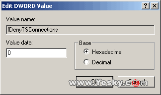 在Terminal Server键下,你将发现一个名为fDenyTSConnection的REG_DWORD型键值。双击这个键值打开“编辑DWORD值”对话框,把1(禁用远程桌面)改成0(启用远程桌面)(如图6)。