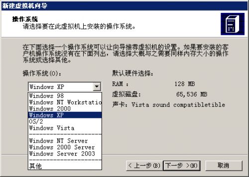 点击下一步,弹出窗口让你选择欲在虚拟机上安装的操作系统,安装软件会根据你选择的系统来自动配置相关硬件配置,如内存大小、虚拟盘大小和声卡,如3所示。