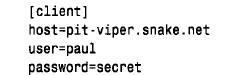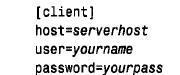 [client] 行标记客户机选项组的开始;它后跟的所有行都是为MySQL 客户机程序获得选项值准备的,这些行一直沿续到文件的结尾或另一不同的参数组的开始。在连接到服务器时,用指定的主机名、用户名和口令替换s e r v e r h o s t、yourname 和y o u r p a s s。对于笔者来说,. m y.cnf 如下所示: