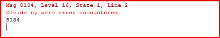 由于除零导致错误的产生,使@@ERROR的值变成8134。实际上8134是一个Error Number,代表某个系统定义的Error,每个预定义的Error由一个唯一的Error Number来唯一标识。@@ERROR本质上就是返回上一个语句执行遇到的Error的ID号,所以这并不是一个随机的值,无论是10/0还是100/0,@@ERROR返回的结果都是一样的。