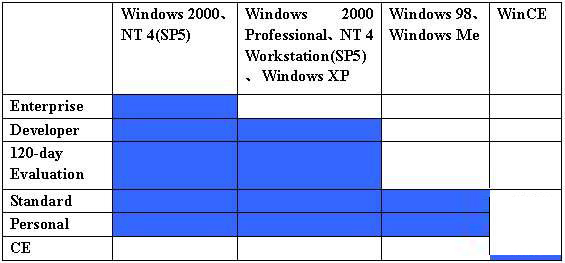 SQL Server 2000有很多版本:企业版、开发版、标准版、个人版等。每一个版本包含的客户端工具基本上是一样的,而服务器组件可能有些不同。所以在安装 SQL Server 之前必须参考“操作系统和SQL Server”版本兼容表(图1),根据操作系统选择合适的 SQL Server 版本。