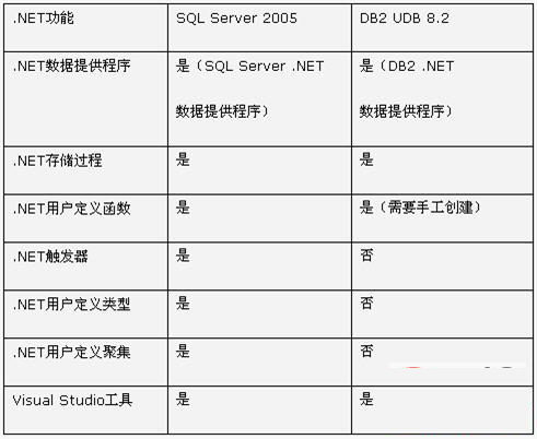 虽然SQL Server 2005和DB2 UDB 8.2都集成了.NET框架和Visual Studio,但各自的集成程度有着显著的差别。下面这张表格中列出了关于它们对.NET的集成程度的比较。