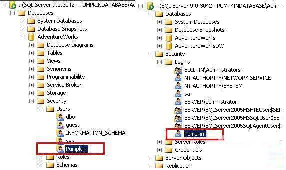 注意这里的Pumpkin,以前我一直都以为这就是SQL SERVER里的用户,但是通过搞一搞之后才发现并非如此。 数据库连接串里的Pumpkin,在SQL SERVER里严格的说,应该叫Login,其实它是一个登录帐号,并不是数据库里用来访问表和操作数据的一个用户。即右图中的Pumpkin。它在数据服务器的Security"Logins的结点下,这里面列出来的是所有的登录帐号。它们的作用就是用来连接数据库并通过验证。