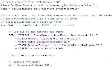 下面的Java代码片断提出一系列非参数特设查询到AdventureWorks数据库中,以此来获得用户销售订单数据。它通过循环,从AdventureWorks SalesOrderHeader表中前20张订单中获得信息。
